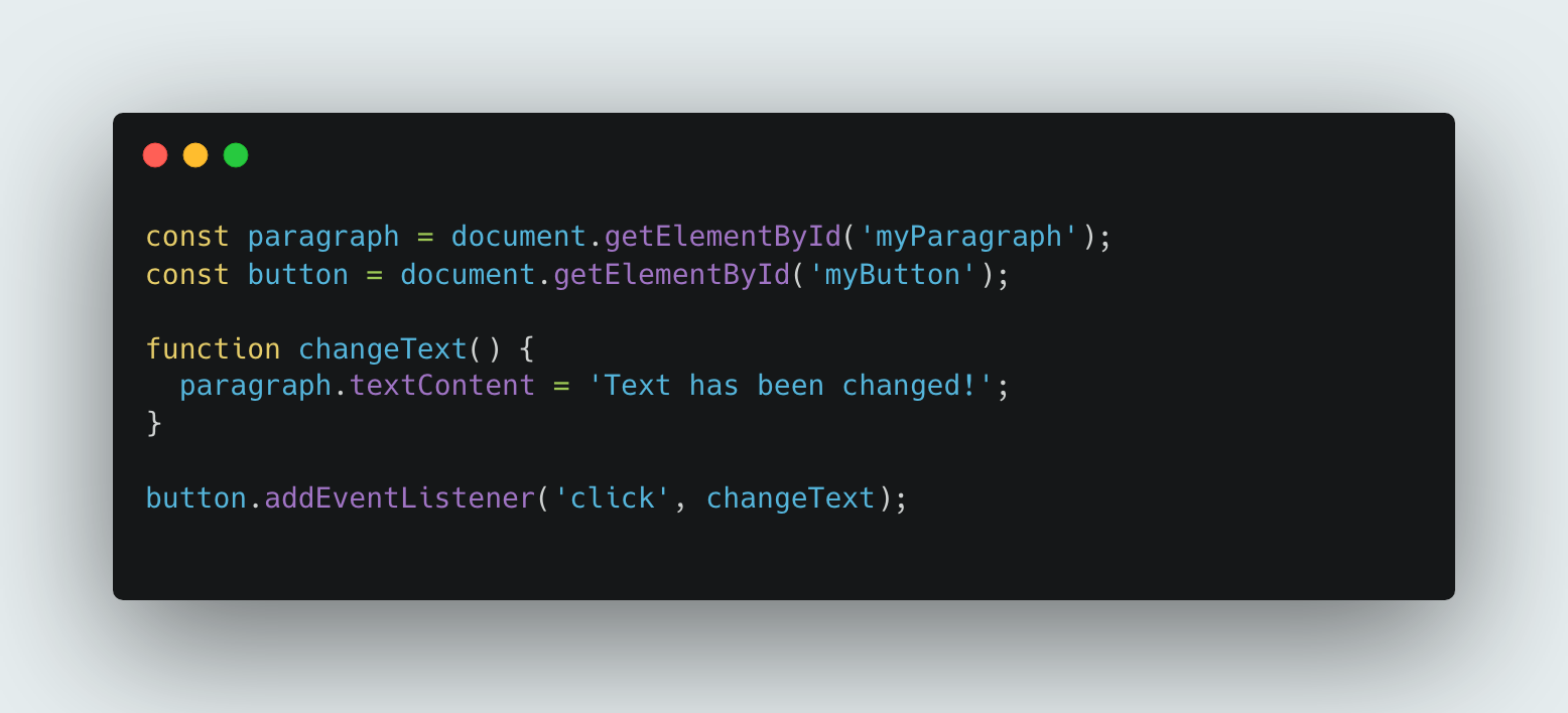 The following example selects the elements, defines a function that changes the text of the paragraph and thn adds an event listener to the button that calls the the changeText function when clicked.